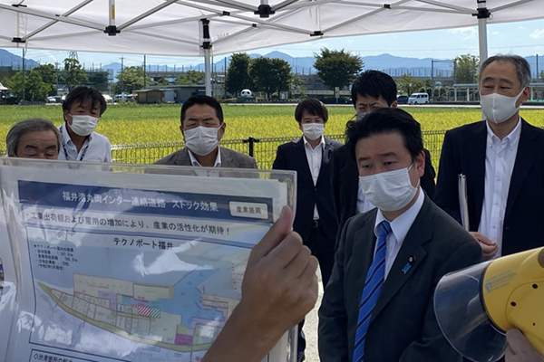 9月2日(水)、和田政務官は福井県を訪問し、その後、一般県道 福井森田丸岡線、福井港丸岡インター連絡道路、中部縦貫自動車道大野油坂道路を視察し、各事業の概要や進捗状況について説明を受けました。また、福井市内にて新型コロナウイルス感染症の影響で厳しい状況にある交通事業者と意見交換会を行いました。