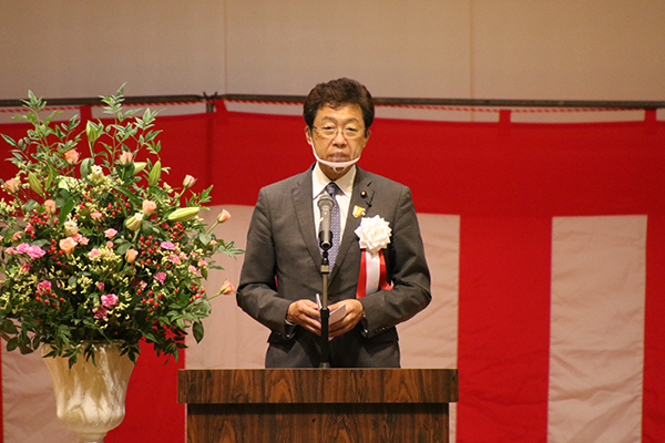 串本太地道路用地幅杭設置式で挨拶する門政務官