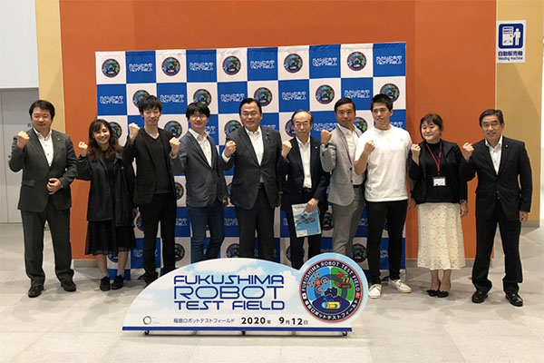 赤羽大臣と福島ロボットテストフィールドの入居事業者の集合写真