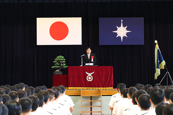 赤羽大臣は、全国各地に旅立つ卒業生(210名)に対し、「これから皆さんが活躍する海は、古来より、多くの恩恵を授け、国家繁栄の要として我々を見守ってくれております。ただ今より、皆さんは、見守られる立場から、守る側に立ち、この「平和で豊かな海」を次世代に継承していくという尊い使命を担うことになります。」と激励を送りました。