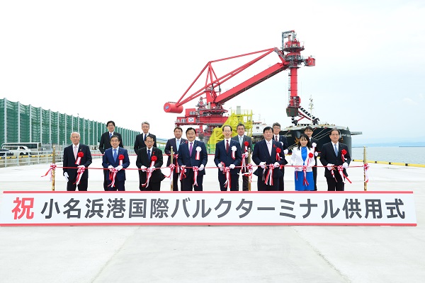 小名浜港バルクターミナル供用式でテープカットする赤羽大臣