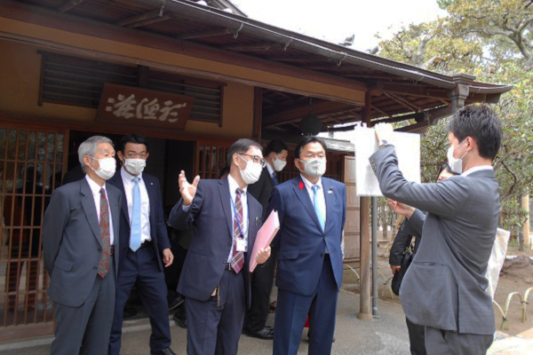 陸奥宗光別邸跡で説明を受ける赤羽大臣