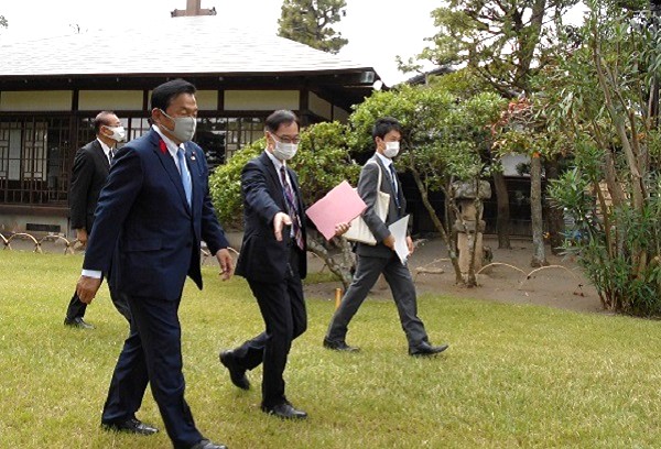 旧大隈重信別邸前の庭園を視察する赤羽大臣