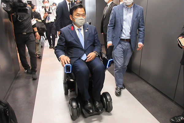自動走行パーソナルモビリティに試乗する赤羽大臣