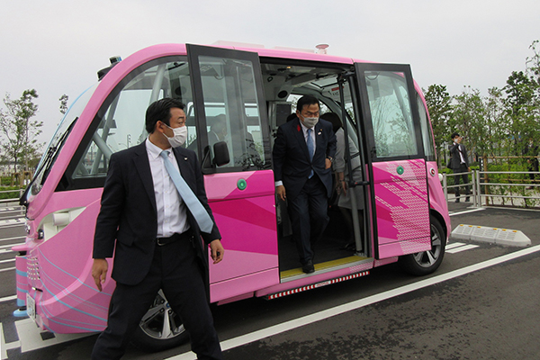 また、羽田第1ゾーンスマートシティでは、各開発担当の方と意見交換を行い、自動走行モビリティを試乗したほか、施設や各種ロボット・モビリティのデータを連携させるシステムなどを視察しました。視察後の会見では「コロナ禍を受けて、働き方の転換や、非接触・リモートの推進が課題となる中で、スマートシティの推進は一層重要となる。」旨、述べました。