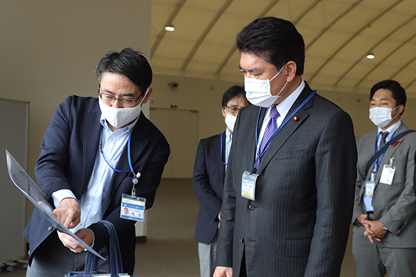 大黒ふ頭客船ターミナルで説明を受ける小林政務官