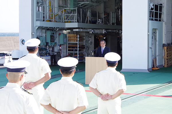 巡視船しゅんこうにおいて職員を激励する大西副大臣