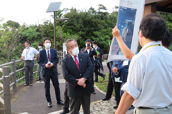 名瀬港の整備状況について大熊展望台にて説明を受ける大西副大臣