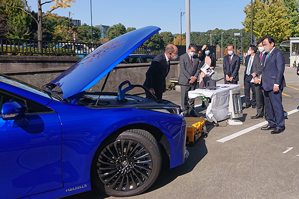 関係者から改良点などの説明を受けるとともに、ハロゲンヒーター、電気ポッド、パソコンや携帯電話へ給電が行なわれる様子を視察しました。その後、MIRAIに試乗し、都内を走行しました。