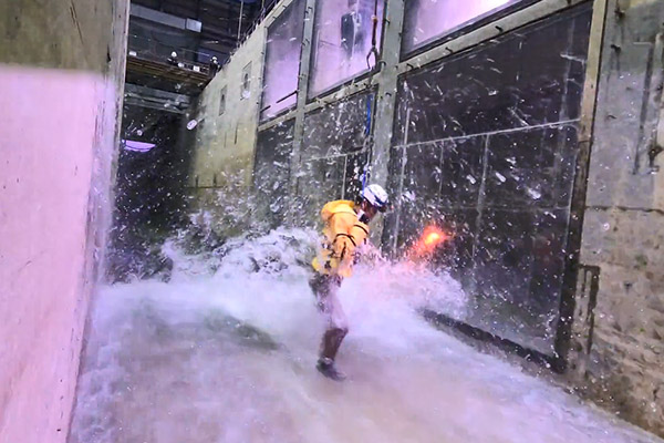 大規模波動地盤総合水路(港空研)において津波実験を体験する朝日政務官