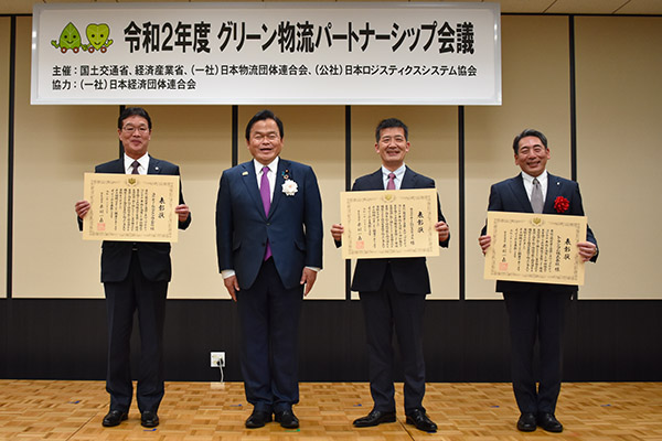 国土交通大臣表彰を受賞された、「スワップボディを活用した共同輸送事業」に取り組まれた事業者((株)ホームロジスティクス、ユニ・チャームプロダクツ(株)、トランコム(株))に対し、赤羽大臣から表彰状を授与しました。