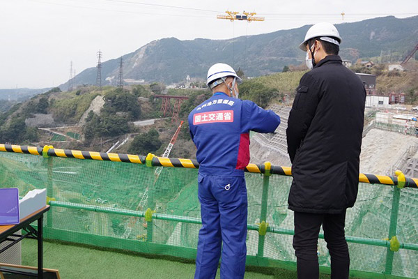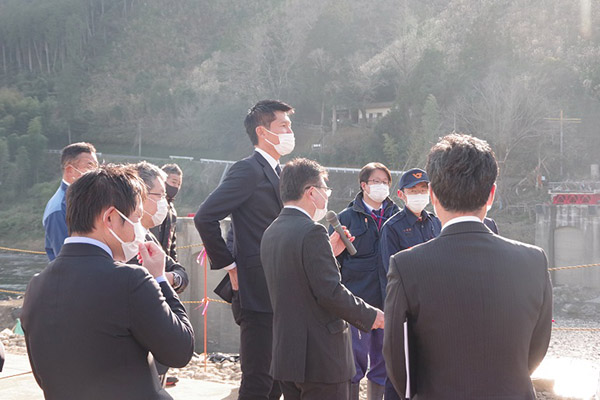 立野ダム(南阿蘇村)で説明を受ける朝日政務官