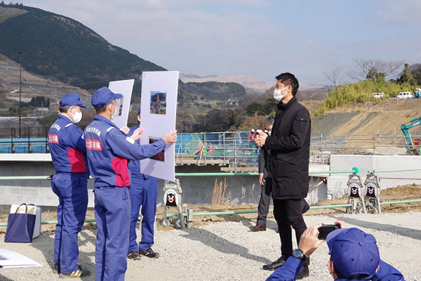 新阿蘇大橋(南阿蘇村)で説明を受ける朝日政務官