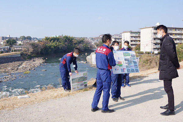 白川激特事業箇所(熊本市龍田陳内)で説明を受ける朝日政務官