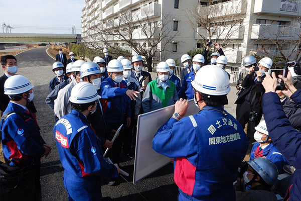 各現場において、大臣は、「多摩川では、緊急治水対策プロジェクトを立ち上げて、地域と一体となって対策を進めてきたところ。豪雨対策については、河川単体での対策だけでなく、ハードソフト一体となった流域治水が大事。多摩川は河川利用者、特に子連れが多く、現場も狭いので、安全に工事を進めてほしい」と述べました。