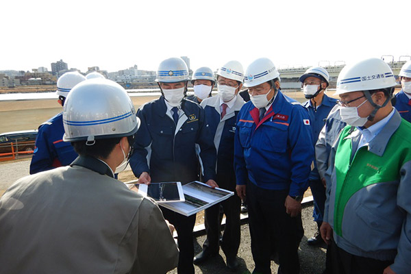 二子玉川地区堤防整備事業(世田谷区)で説明を受ける赤羽大臣
