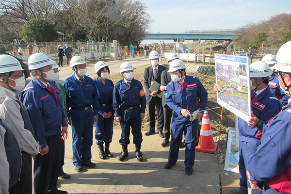 多摩川における令和元年10月の東日本台風による水害からの復旧状況などについて説明を受け、現地視察を行いました。