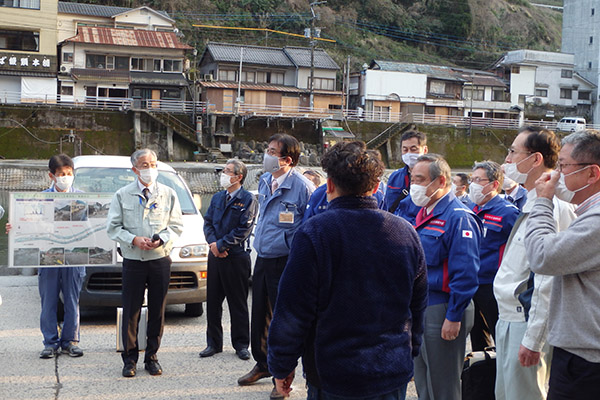 また、令和2年7月豪雨により被災を受けた河川及び道路の復旧状況について視察を行い、日田市長及び大分県、地元関係者等と意見交換を行いました。