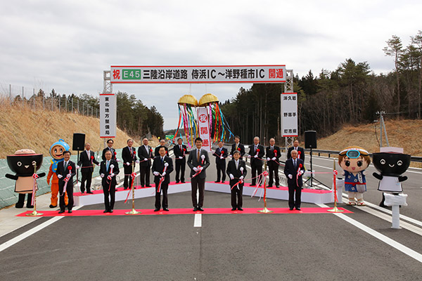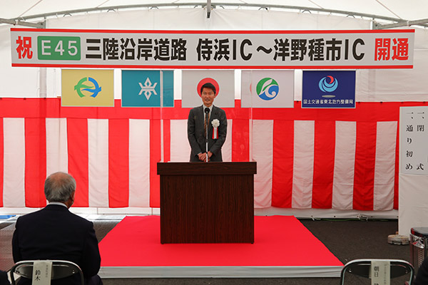 挨拶のなかで、「今回の開通により、三陸沿岸の地域振興や観光振興、また東日本大震災からの復興の力強い後押しになってくれるものと期待している。三陸沿岸道路は、今年中の全線開通を目指して、関係者の皆様と力を合わせて取り組んでいく」旨、述べました。