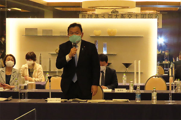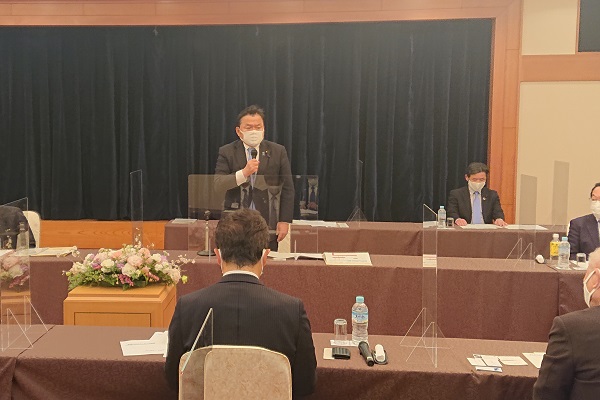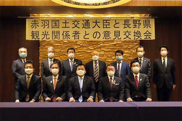 長野県の観光関係者との意見交換会で挨拶をする赤羽大臣