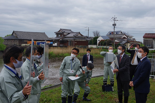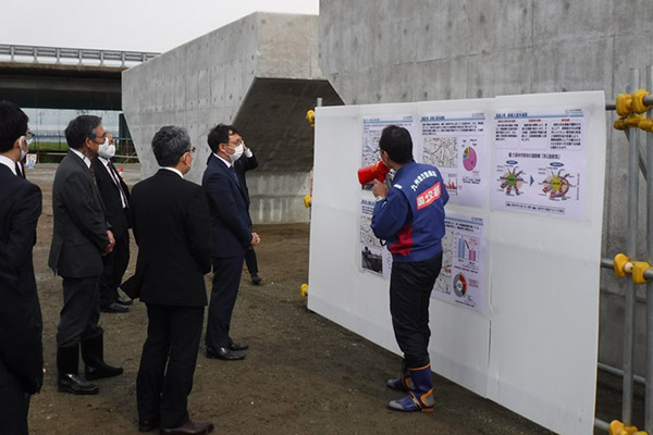 山ノ井排水機場において浸水対策の説明を受ける鳩山政務官