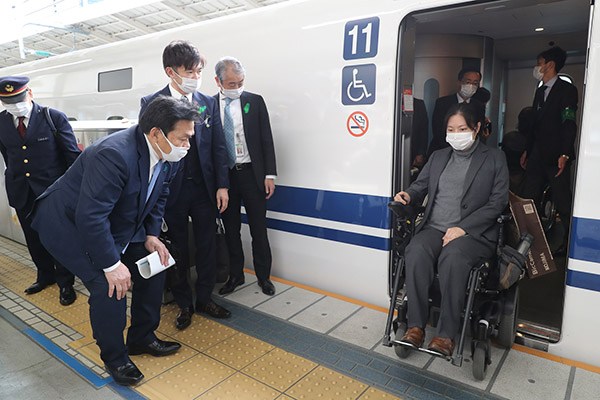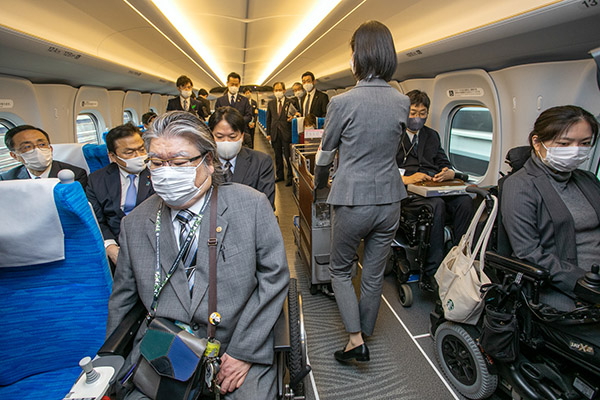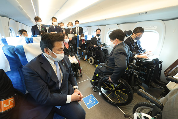 4月15日、赤羽国土交通大臣は、昨年10月に改正された省令に基づき6席分の車椅子用フリースペースが整備されたN700S新幹線車両に6名の車椅子使用者の方々とともに、新横浜~東京駅間を試乗し、車内で意見交換を行いました。この新型車両は4月20日から営業を開始します。