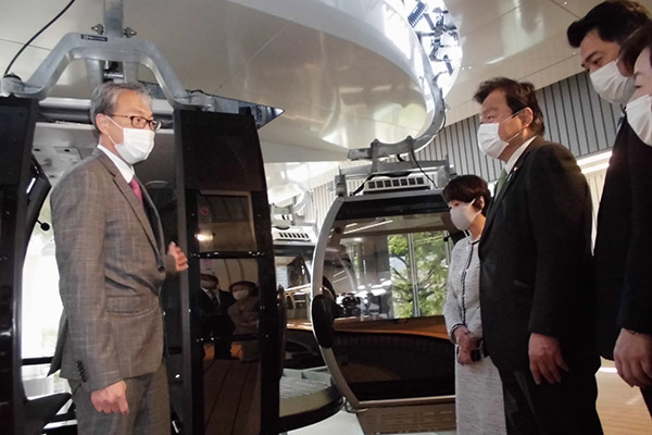 YOKOHAMA AIR CABINの事業概要について説明を受ける赤羽大臣