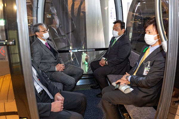 赤羽国土交通大臣は4月16日(金)、4月22日(木)の営業開始に先立って、横浜みなとみらい地区の都市型循環式ロープウェイ YOKOHAMA AIR CABINを訪問し、事業概要について説明を受けるとともに、運河パーク駅~桜木町駅(往復)を試乗しました。試乗後、大臣は「横浜を新しい角度から楽しめる。新たな賑わいの創出につながることを期待したい」と述べました。