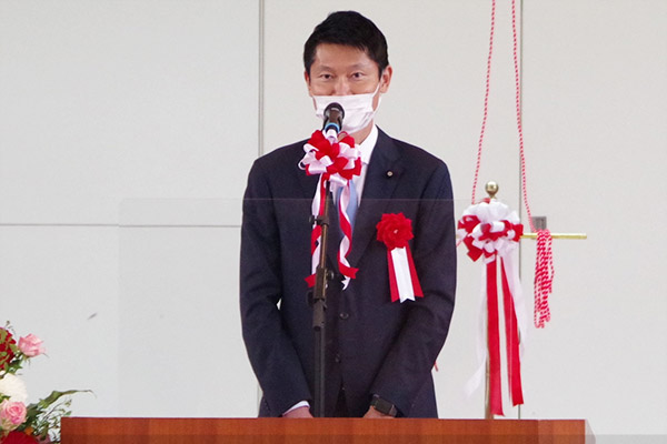 「西原村集落再生事業竣工式」で祝辞を述べる朝日政務官