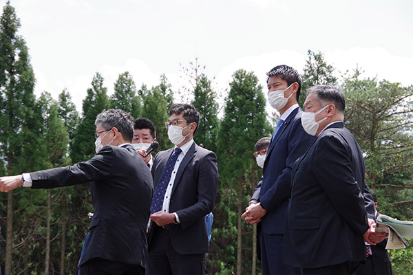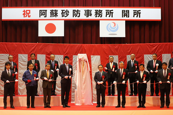 同日午後には、熊本県阿蘇市で開催された「阿蘇砂防事務所開所式」に出席しました。式辞の中で、「阿蘇砂防事務所を設置することで、事前防災対策としての直轄砂防工事を強力に推進できる。阿蘇地域の『いのちくらしを守る』ためしっかりと努力し、直轄砂防事業を通じて地域の安全・安心と火山との共生を掲げる地域づくりに貢献する。」旨を述べました。また、同事務所で実施している砂防堰堤工事などの現地視察も行いました。
