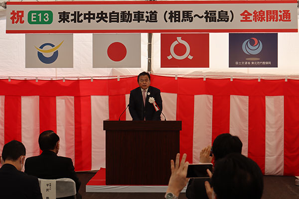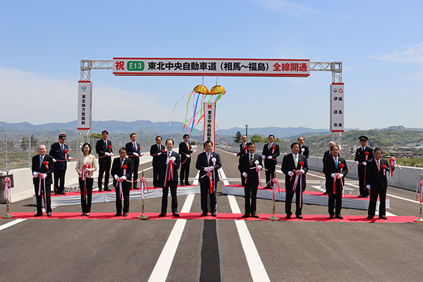 赤羽大臣は、挨拶のなかで、「東北中央自動車道(相馬~福島)の全線開通 により、悪天候や災害時においても寸断されない道路ネットワークが形成さ れ、所要時間も短縮されるほか、縦軸の東北自動車道、常磐自動車道と、横軸 の東北中央自動車道(相馬~福島)などの高速道路が繋がることにより、効率 的な交通経路の選択が可能となる。復興道路・復興支援道路について、残るは 三陸沿岸道路になるが、年内の全線開通に向け、国土交通省としてもしっかり 取り組むとともに、常磐自動車道の4車線化も加速してまいりたい」旨、述べ ました。