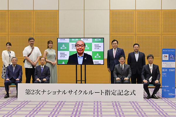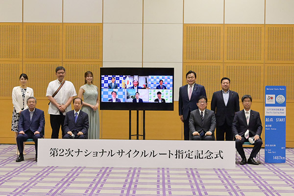 また、本指定記念式には、令和3年5月31日(月)に第2次ナショナルサイクルルートとして指定された、「トカプチ400」(北海道)、「太平洋岸自転車道」(千葉県、神奈川県、静岡県、愛知県、三重県、和歌山県)及び「富山湾岸サイクリングコース」(富山県)の3ルートの関係道県の知事等にオンラインで出席いただいたほか、関係道県の東京事務所職員の皆様、来賓として自転車活用推進議員連盟の皆様及び司会進行として平成30年度から「自転車アンバサダー」を務めている稲村亜美さんにも出席いただきました。