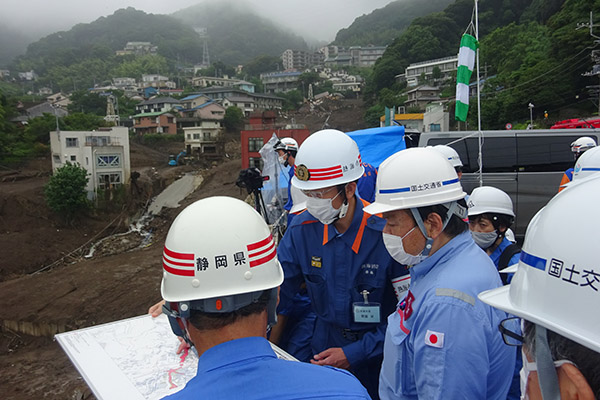7月8日(木)、赤羽大臣は、静岡県において、令和3年7月1日からの大雨による土砂災害で被災した国道135号、伊豆山神社周辺を視察するとともに、熱海市内の避難所にて