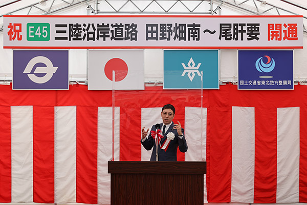 鳩山国土交通大臣政務官は、挨拶のなかで、「この度の開通により、経済的なストック効果が大きく発揮されるとともに、多くの観光客の方々がこの道路を利用し、観光地を訪れることで観光の起爆剤となることが期待される。そして復興道路として、命の道としても活用していただきたい。」旨、述べられました。