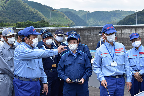 7月28日(水)、赤羽大臣は、令和3年7月の大雨により被災した川内川水系山野川の被災箇所(鹿児島県伊佐市)のほか、川内川の鶴田ダムを視察しました。