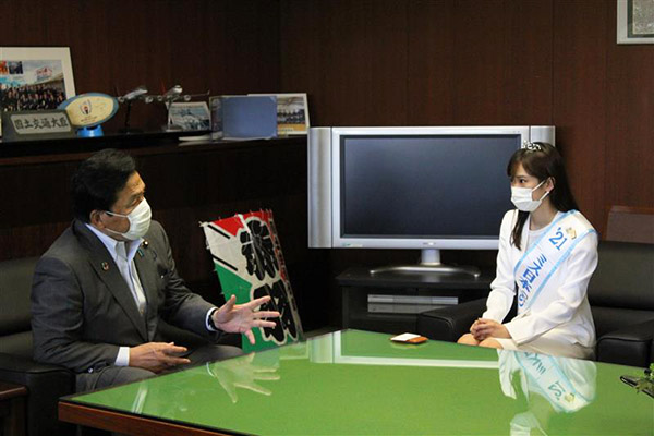 令和3年8月5日(木)、赤羽国土交通大臣は、2021ミス日本「水の天使」の嶺百花(みねももか)さんの表敬訪問を受けました。