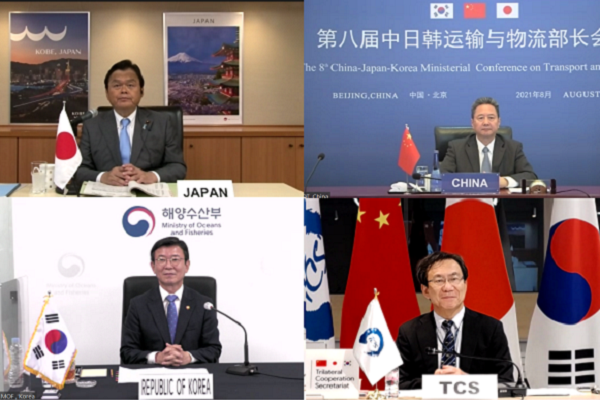8月20日(金)、日中韓三国の物流のあり方について議論するため、「第8回日中韓物流大臣会合」が、日本主催によりオンライン形式で開催され、赤羽一嘉国土交通大臣のほか、中国から李小鵬(リー・シャオペン)交通運輸部長、韓国から文成赫(ムン・ソンヒョク)海洋水産部長官、日中韓三国協力事務局※の道上尚史 事務局長が出席しました。