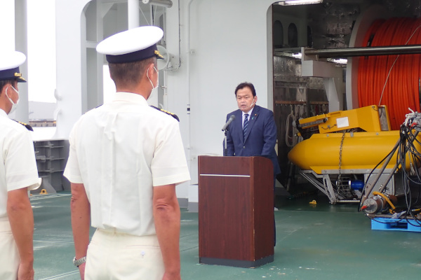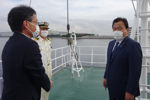 その後、船上において「皆さんの日々の活躍の成果が、日本の「海」に、そして安全・安心の未来に大きな「光」を当てることとなるよう、心から期待したい」と乗組員を激励しました。