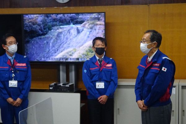 引き続いて、7月3日に土石流災害の発生した熱海市伊豆山逢初川で被災状況及び復旧工事状況を視察するとともに、国直轄による緊急砂防工事を実施している「熱海緊急砂防出張所」を訪れ、職員を激励しました。
