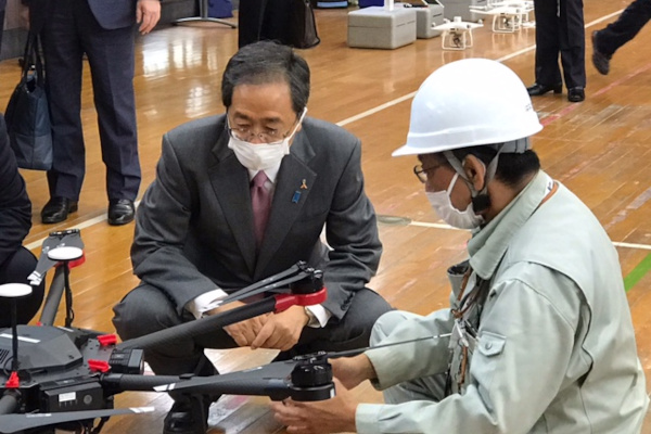 富士教育訓練センターでドローンについて説明を受ける斉藤大臣