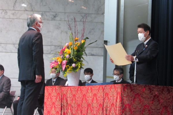 受賞者に表彰状を授与する泉田政務官
