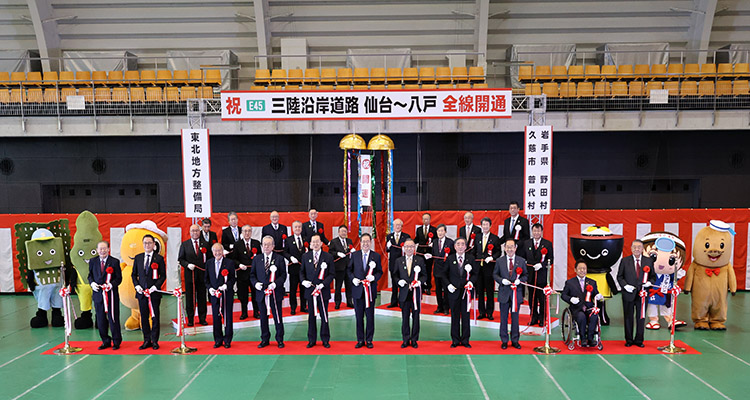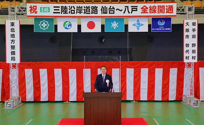 大臣は、挨拶のなかで、「三陸沿岸地域を通る大動脈が全線開通し、豊かな水産物が三陸沿岸道路を通じて、全国の多くの方々の元へお届けできるようになるなど、地域産業の活性化や観光振興、災害時における緊急避難や物資輸送、救命救急活動に活用され、復興を力強く支援していくものと期待している」旨、述べました。