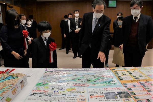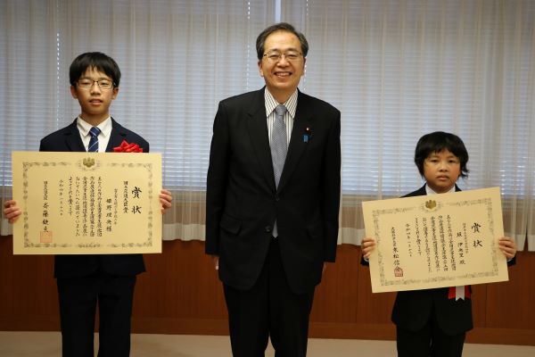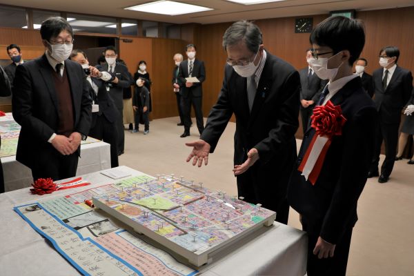 令和4年1月12日(水)、「第25回全国児童生徒地図優秀作品展」における大臣賞の表彰式が行われ、斉藤大臣から国土交通大臣賞及び文部科学大臣賞の受賞者に対して、表彰状と盾が授与されました。
