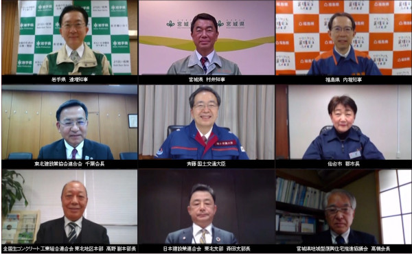 1月16日(日)、斉藤大臣は、オンラインで開催された「第12回 復興加速化会議」に出席しました。会議では、岩手県知事、宮城県知事、福島県知事、仙台市長、建設業などの団体の代表者と、施工確保対策や震災の記憶と教訓を次世代に繋げる取組等について意見交換を行うとともに、デジタル・トランスフォーメーションの促進などによる、建設業の生産性向上や働き方改革、担い手確保・育成といった課題に取り組んでいくことを表明しました。