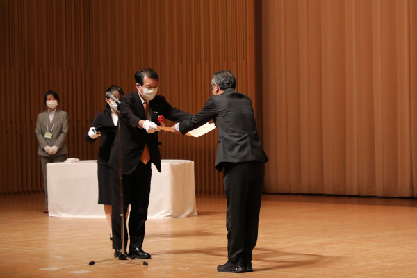 コンクールの表彰式では、国土交通大臣賞を受賞した姫路市立白鷺小中学校に対し、泉田政務官より表彰状が授与されました。
