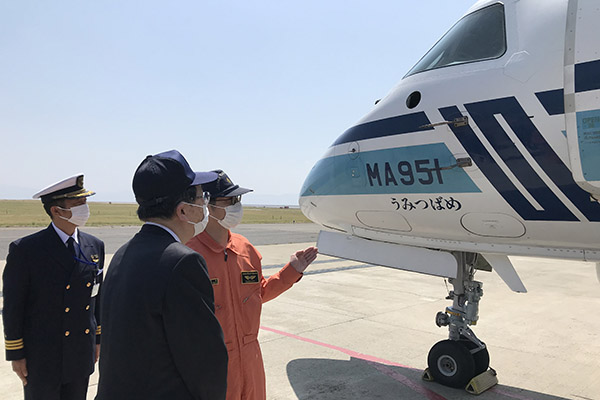 関西空港海上保安航空基地を視察する斉藤大臣