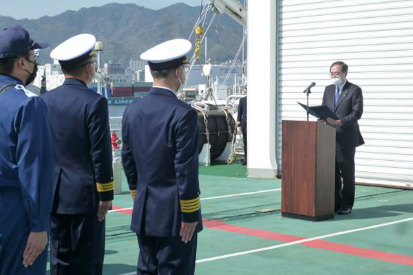 巡視船せっつ船上において職員を激励する斉藤大臣