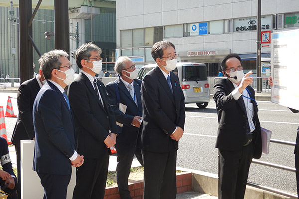 神戸三宮駅で交通ターミナルの整備状況について説明を受ける斉藤大臣