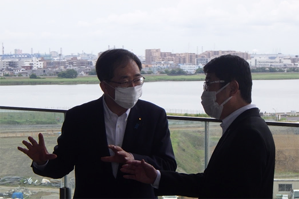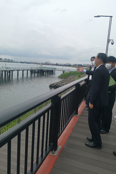 令和4年6月11日(土)、斉藤大臣は、羽田空港及び周辺エリアの防災・減災対策等を確認するため、羽田イノベーションシティ、多摩川スカイブリッジ、護岸エリアを視察しました。