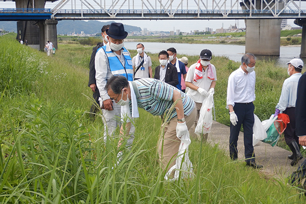 斉藤大臣は参加者に対し、日頃からの河川環境保全活動への感謝を述べ、河川清掃を行いました。
